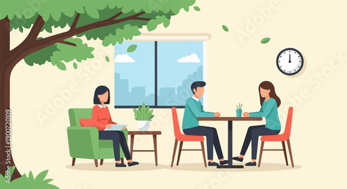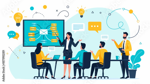 Векторная иллюстрация офисных людей, дающих презентацию, работающих на компьютере на рабочем месте. Деловые люди, символы, значки, выделенные на белом фоне. Элементы дизайна в плоском стиле.