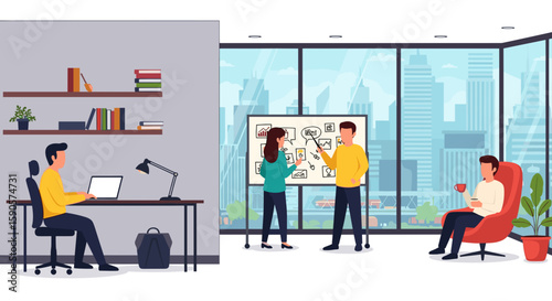 Векторный набор баннеров для бизнес-презентаций и встреч. Плоский дизайн деловых людей или офисных работников. Офисный интерьер.