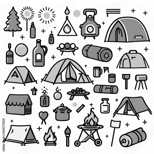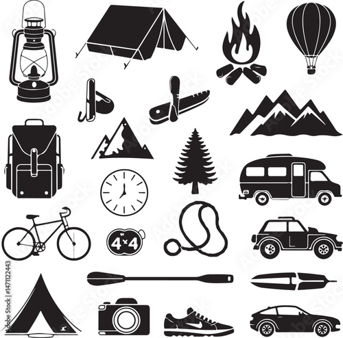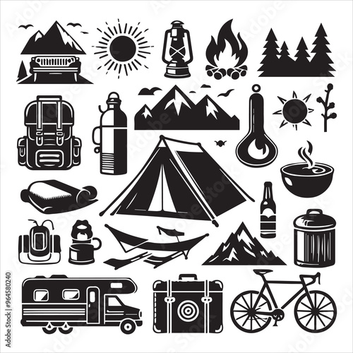 Векторный набор объектов кемпинга, изолированных на белом фоне. Значки и эмблемы путешествий. Приключенческие этикетки на открытом воздухе, горы, палатка, машина, рафтинг, костер.
