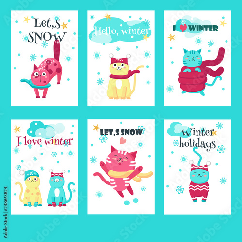 Векторный набор открыток на день Святого Валентина с милыми влюбленными кошками и вдохновляющими цитатами. Счастливые любящие котята обнимаются, играют, держат сердечки.