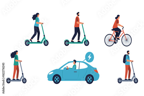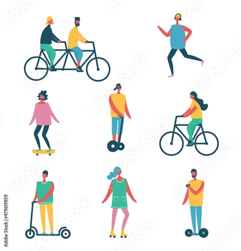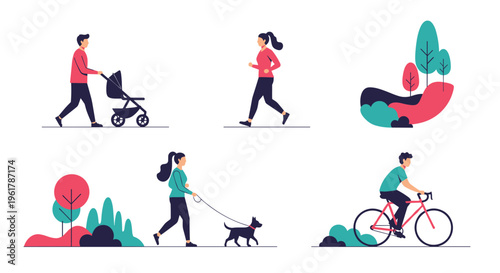 Векторный набор мультяшных персонажей, изолированных на белом фоне. Люди в парке элементы дизайна и иконки в плоском стиле. Бег трусцой, езда на велосипеде, выгул собак.