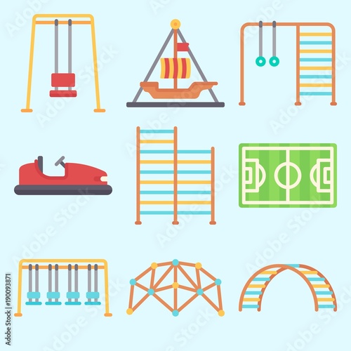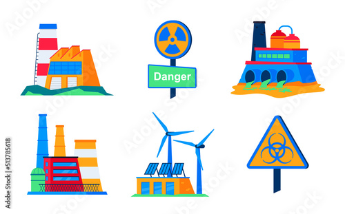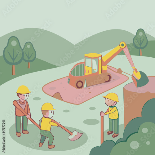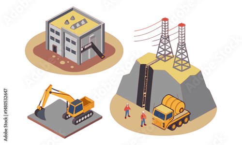 Векторный набор объектов и инструментов строительной площадки, изолированных на белом фоне. Значки строительного оборудования в плоском стиле. Кран, кирпичи, вывеска, бетономешалка.