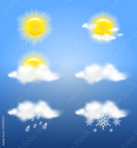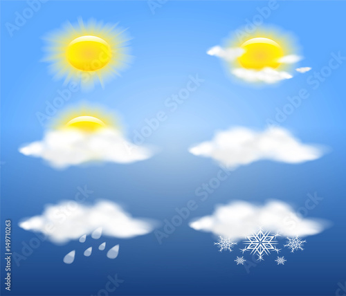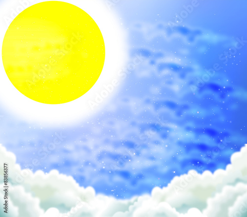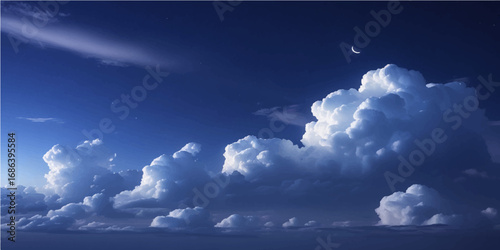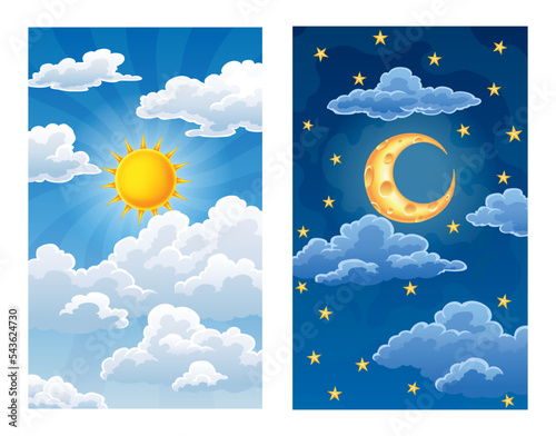 Векторный набор дневных и ночных горизонтальных баннеров с небесным пейзажем. Дневное голубое небо с солнцем и белыми облаками и ночное темно-синее небо с полумесяцем и звездами.