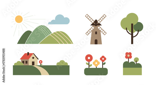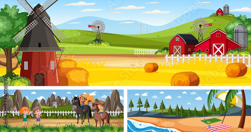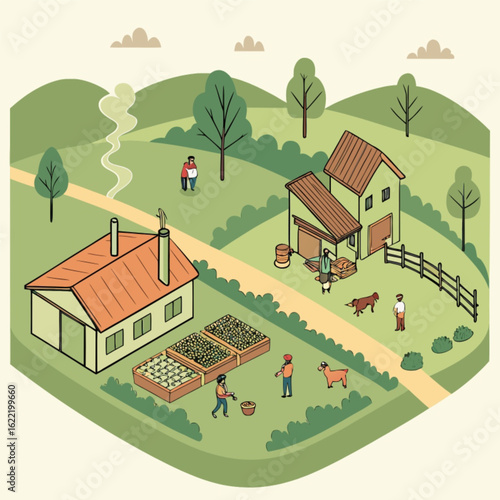 Векторный набор плакатов с концепцией фермерства, баннеров. Люди, работающие на пасеке и ферме, собирают урожай пшеницы на поле. Рабочие и сельскохозяйственная техника, элементы дизайна в плоском стиле.