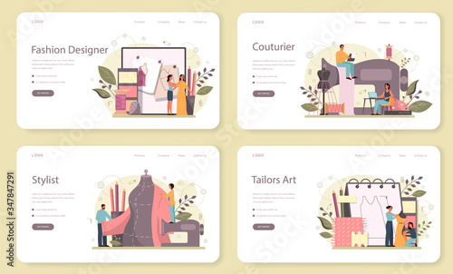 Векторный набор модных салонов, горизонтальных баннеров швейной мастерской. Драпировка, пошив в ателье и элементы дизайна в плоском стиле ателье.