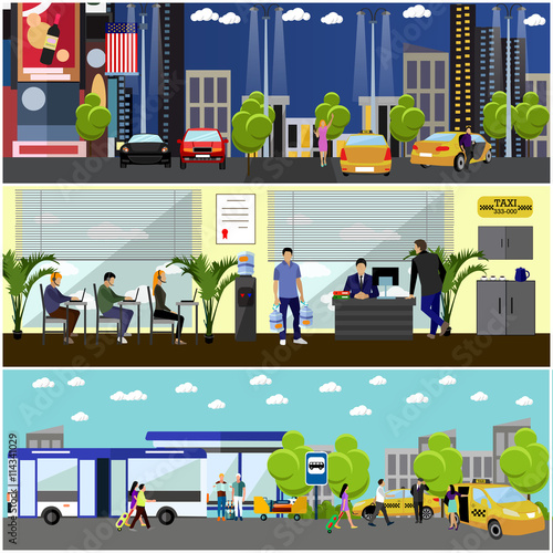 Векторный набор плоских плакатов быстрого питания, баннеров с интерьером ресторана, профессиональным персоналом и посетителями, курьерами, доставляющими еду на велосипеде и пешком, люди едят пиццу на вынос дома.