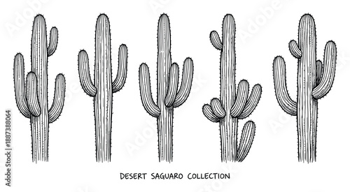 Векторный набор нарисованных от руки кактусов. Эскиз иллюстрации. Разные кактусы в монохромном стиле.