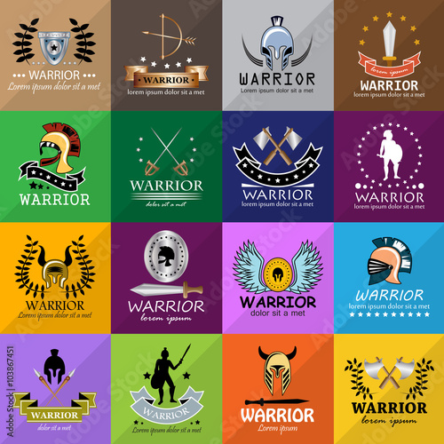 Векторный набор геральдических рыцарских ярлыков в винтажном стиле. Элементы дизайна, иконки, логотип, эмблемы и значки, изолированные на белом фоне. Рыцарь воин в шлеме и с мечом