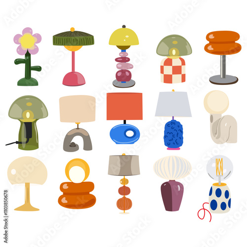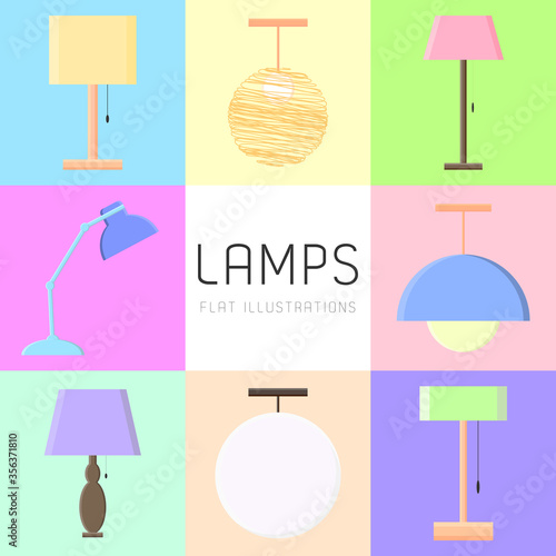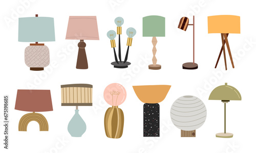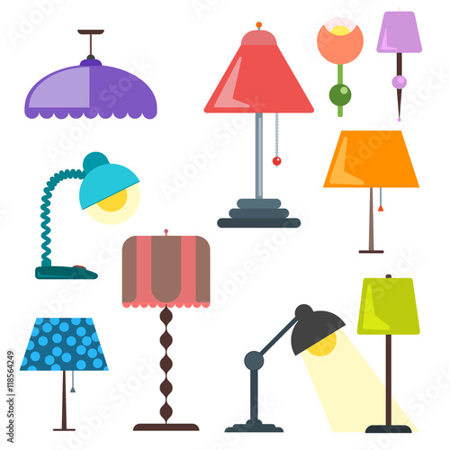 Векторный набор домашнего света в плоском стиле. Иллюстрация с лампами, изолированными на белом фоне. Элементы дизайна и иконки.