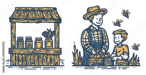 Векторный набор этикеток с медом и логотипом пчеловодства. Типографские элементы для рекламы сладкого и свежего натурального продукта, для упаковки. Надпись Лучший мед, Мед, Дедушкин мед.