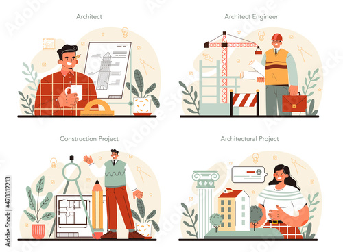 Векторный набор квадратных плакатов отеля. Элементы дизайна в стиле квартиры для официанта, швейцара, чаевых и менеджера.