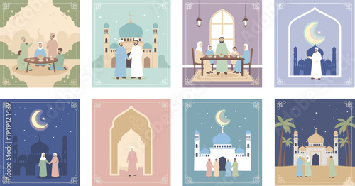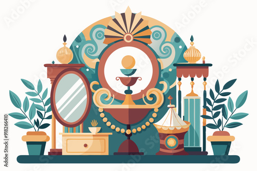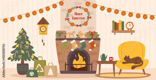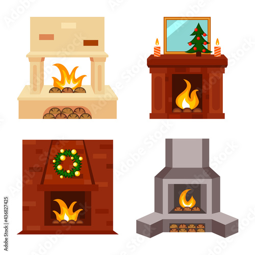 Векторный набор предметов интерьера гостиной дома в плоском стиле. Элементы дизайна и иконки, изолированные на белом фоне. Бабушка сидит в кресле рядом с камином.