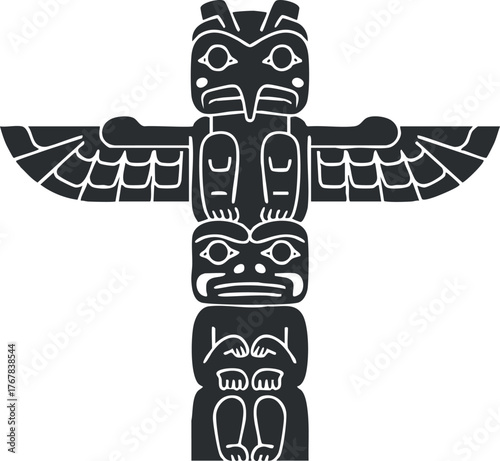 Векторная иллюстрация Будды, североамериканский тотемный столб, этнические племенные маски. Идолы плоские символы, значки, изолированные на белом фоне.