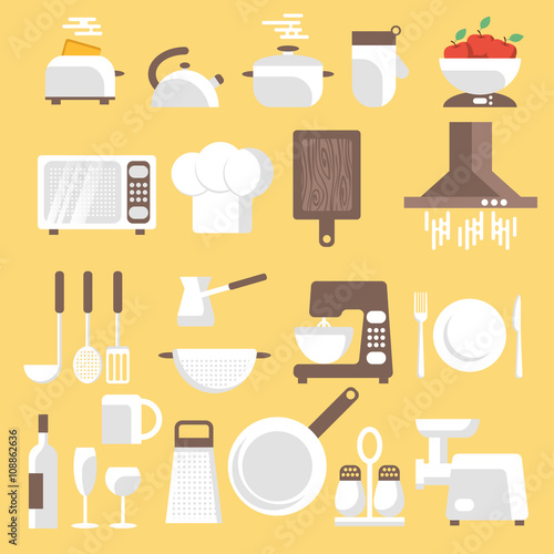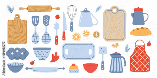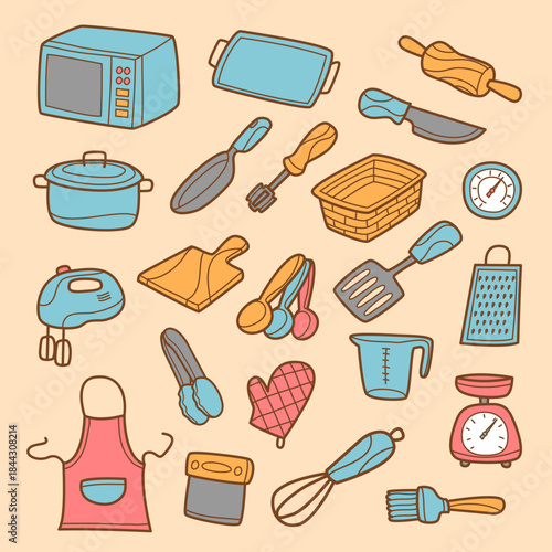 Векторный набор кухонной техники, кухонной утвари и кухонной посуды. Домашняя кухонная утварь для приготовления пищи изолирована. Рисованная иллюстрация в мультяшном стиле каракулей.