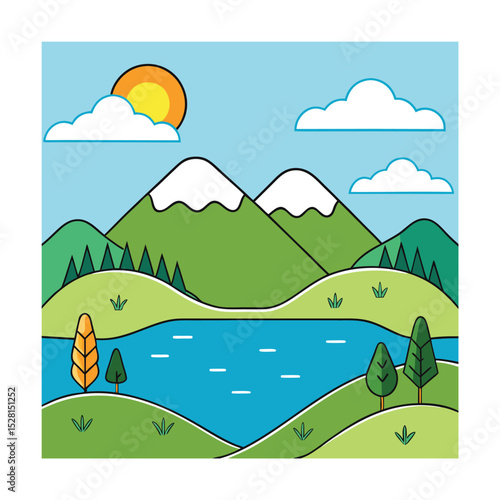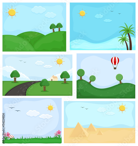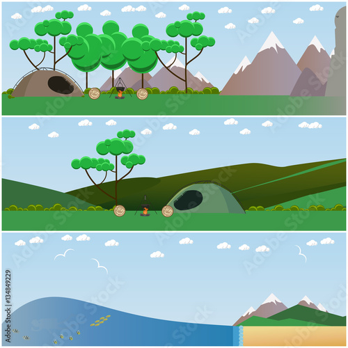 Векторный набор концептуальных плакатов интерьера для отдыха, баннеров, фонов природы. Места для летнего отдыха на свежем воздухе. Дизайн в плоском стиле.