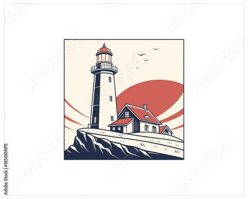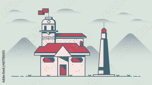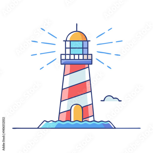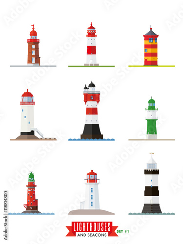 Векторный набор маяков. Элементы дизайна и иконки в плоском стиле, изолированные на белом фоне. Мультяшный маяк со световыми лучами.