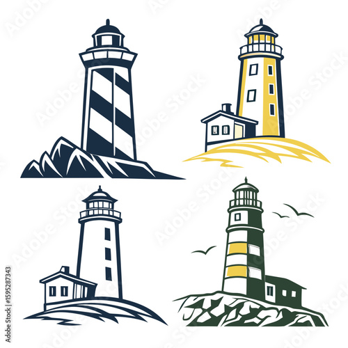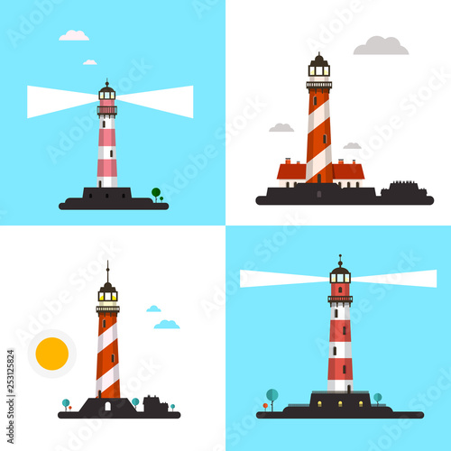 Векторный набор маяков. Элементы дизайна и иконки в плоском стиле, изолированные на белом фоне. Мультяшный маяк со световыми лучами.
