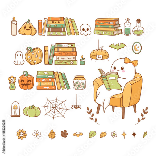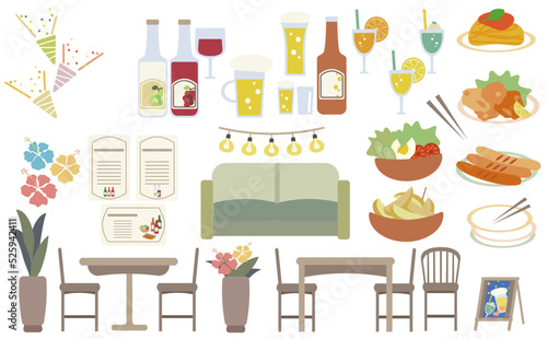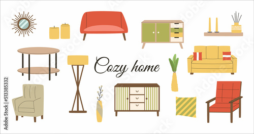 Векторный набор аксессуаров и мебели для гостиной. Современные элементы дизайна интерьера дома. Рисованные изолированные объекты. Стул, камин, диван, шкаф для хранения вещей, стол, полка.