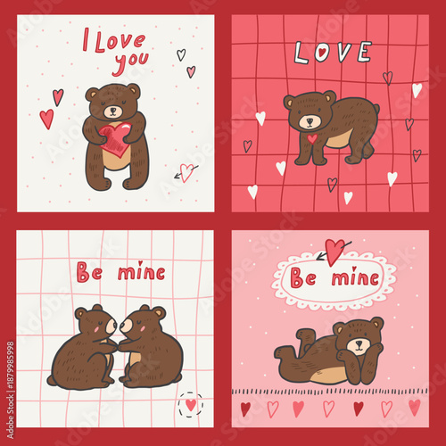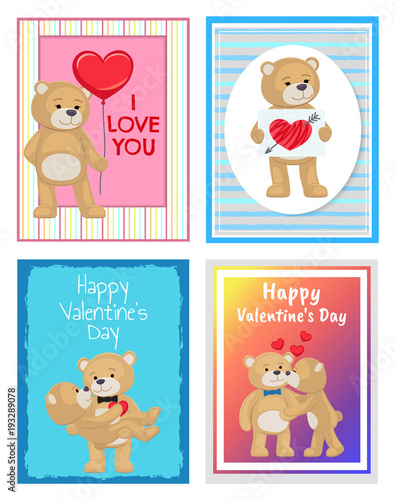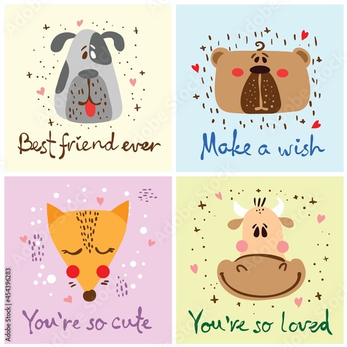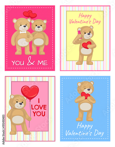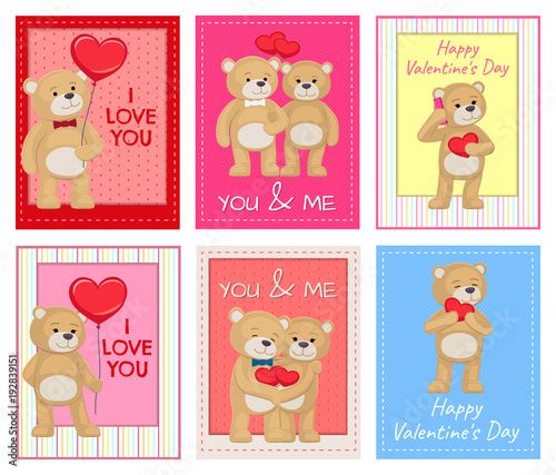 Векторный набор открыток на день Святого Валентина с милыми влюбленными животными и вдохновляющими цитатами. Счастливый кролик, лиса, енот, сова, олень и медведь с воздушными шарами, цветами, сердечками, тортом.