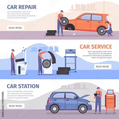 Векторный набор горизонтальных баннеров машинного цеха. Замена стекла и колеса в автомобиле, покраска, Ремонт двигателя и другие элементы дизайна в плоском стиле.