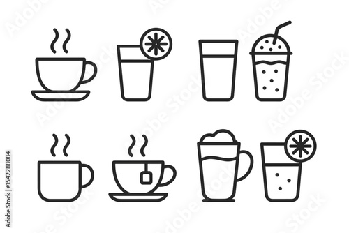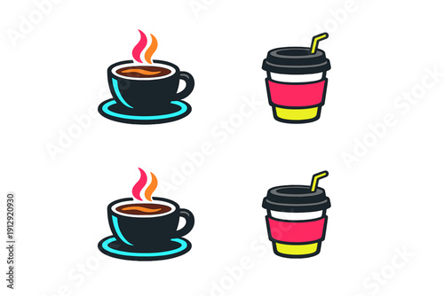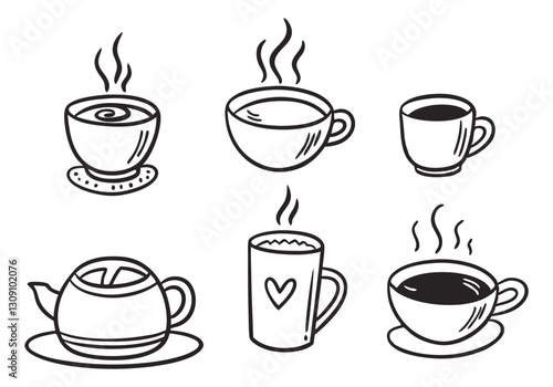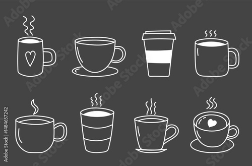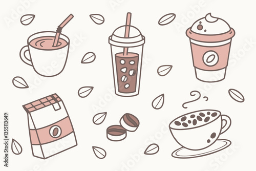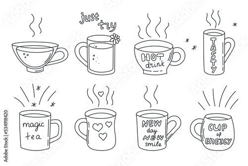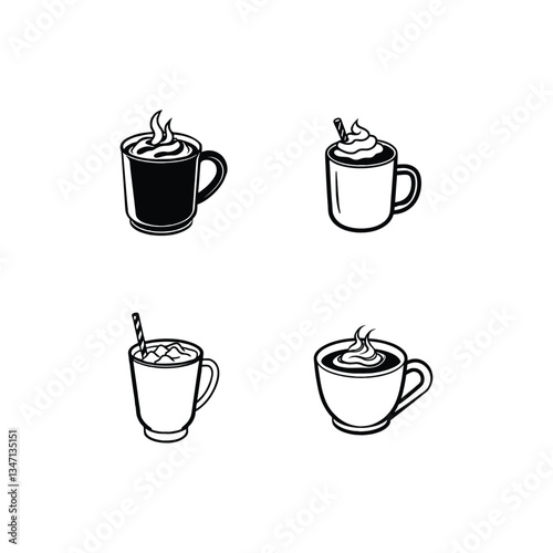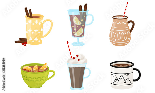 Векторный набор цветных кружек с горячим какао, зефиром, символами зимних праздников, изолированных на белом фоне. Элементы рождественского и новогоднего дизайна для кафе, кофейни, поздравительной открытки, приглашения.