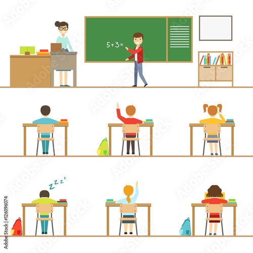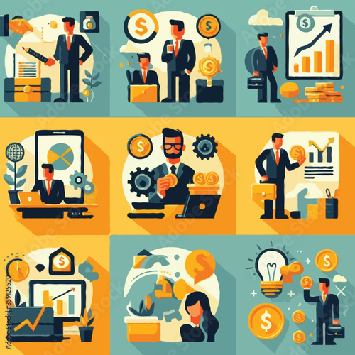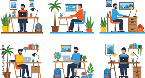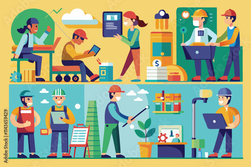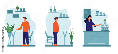 Векторный набор офисных интерьерных баннеров в плоском стиле дизайна. Деловые люди и офисные работники. Офисный интерьер.