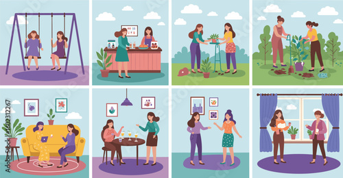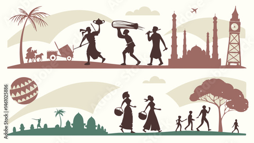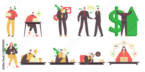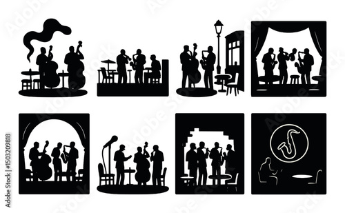 Векторный набор концептуальных плакатов оркестра, баннеров. Музыканты, играющие музыку и поющие на сцене концертного зала и на открытом воздухе, элементы дизайна в плоском стиле.