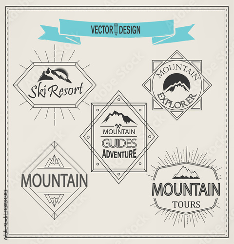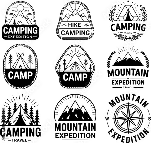 Векторный набор этикеток для активного отдыха, кемпинга и экспедиции в винтажном стиле. Элементы дизайна, иконки, логотип, эмблемы и значки, выделенные на белом фоне. Иллюстрация приключений в лагере на открытом воздухе.
