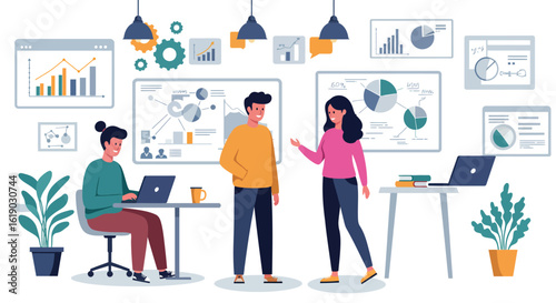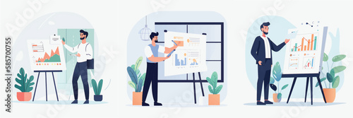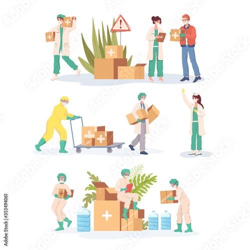 Векторный набор людей в супермаркете. Женщина и мужчина покупают продукты. Изолированная иллюстрация. Женщина берет с полок косметику. Касса, кассир.