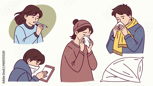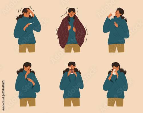 Векторный набор людей с симптомами болезни. Персонажи женского пола изолированы. Женщина чувствует себя плохо, у нее простуда, сезонный грипп, лихорадка, насморк, кашель, головная боль.
