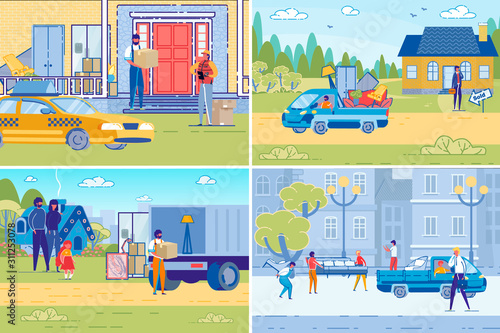 Векторный набор плакатов с домашними животными, баннеров. Игры дома и прогулки на улице с домашними животными, собакой, кошкой и домашним кроликом демонстрируют элементы дизайна в плоском стиле.