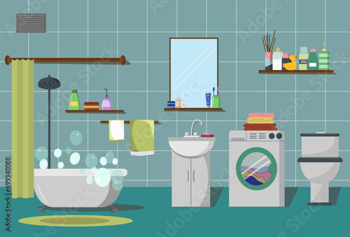 Векторный набор плакатов, баннеров с мебелью для ванной комнаты, ванной, умывальником, стиральной машиной, туалетом и аксессуарами в плоском стиле.