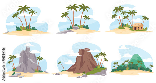 Векторный набор плакатов, баннеров с элементами дизайна музейных экспозиций в плоском стиле. Экспонаты пещерных людей, бюст Нефертити, чучела диких и вымерших животных.