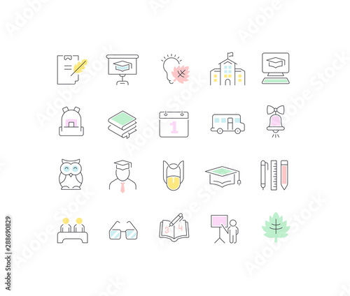 Векторный набор иконок школьного образования в стиле тонкой линии. Физика, химия, биология и другие предметы. Пользовательский интерфейс веб-сайта и значок мобильного веб-приложения. Иллюстрация контурного дизайна
