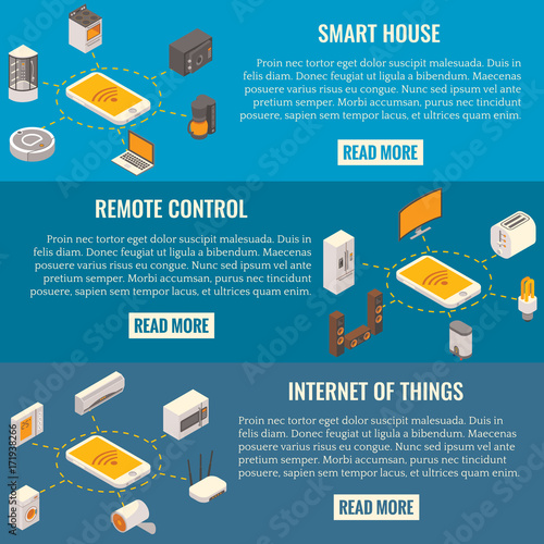 Векторный набор горизонтальных баннеров концепции умного дома. Умный дом, дистанционное управление, Интернет вещей плоские 3d изометрические шаблоны.