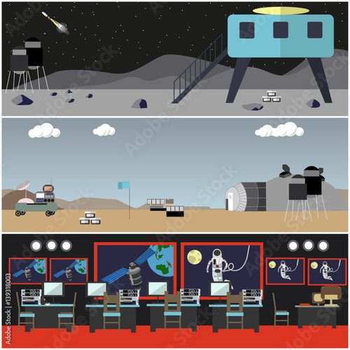 Векторный набор плакатов космической концепции, баннеров. Центр управления полетами, космическое пространство, космические базы на Марсе и на Луне, элементы дизайна в плоском стиле космических технологий.