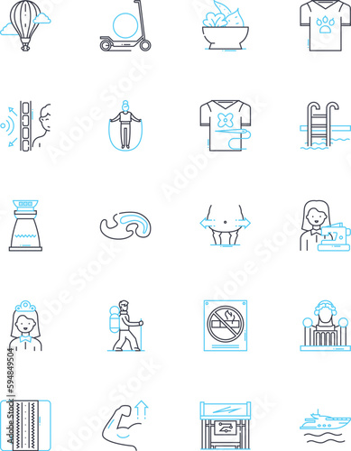 Векторный набор спортивных иконок в стиле тонкой линии. Волейбол, лакросс, лыжи, фехтование, гольф, рюкзак. Пользовательский интерфейс веб-сайта и значок мобильного веб-приложения. Иллюстрация контурного дизайна