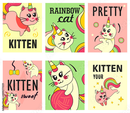 Векторный набор весенних открыток с милыми кошками и вдохновляющими цитатами. Счастливые котята летят на воздушном шаре, держа в руках корзину, полную цветов, с птицей на голове и букетами цветов.