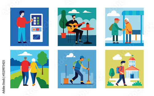 Векторный набор элементов дизайна концепции уличного движения в плоском стиле. Люди переходят улицу, ловят такси, выгуливают собак, ходят по магазинам. Мать с детской коляской. Автобусная остановка, светофор, дорожный знак.