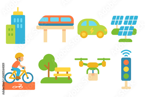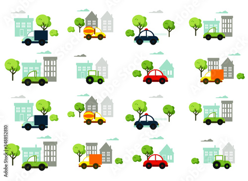 Векторный набор плакатов уличного движения, баннеров в плоском стиле. Прогулка с ребенком, Элементы дизайна магазина, такси и светофора.