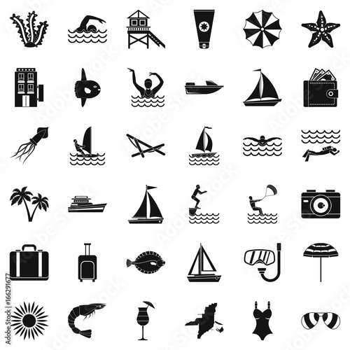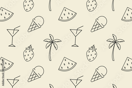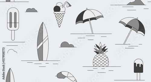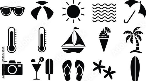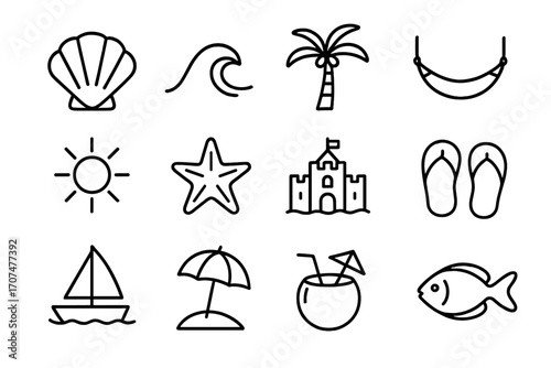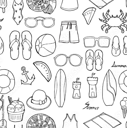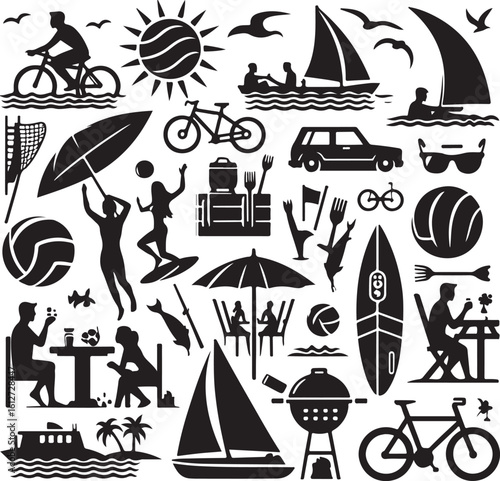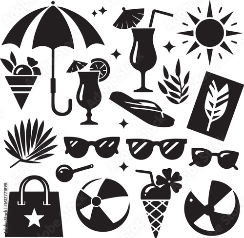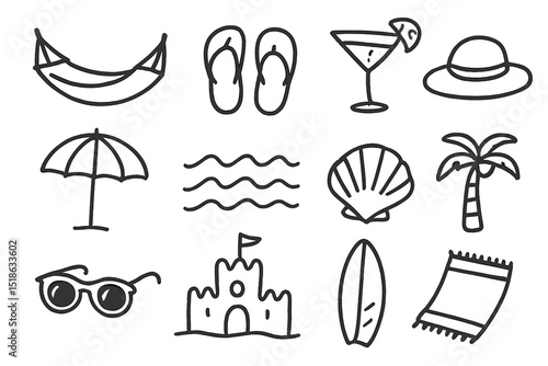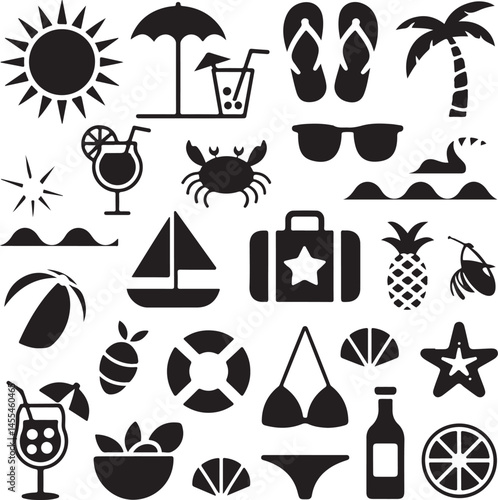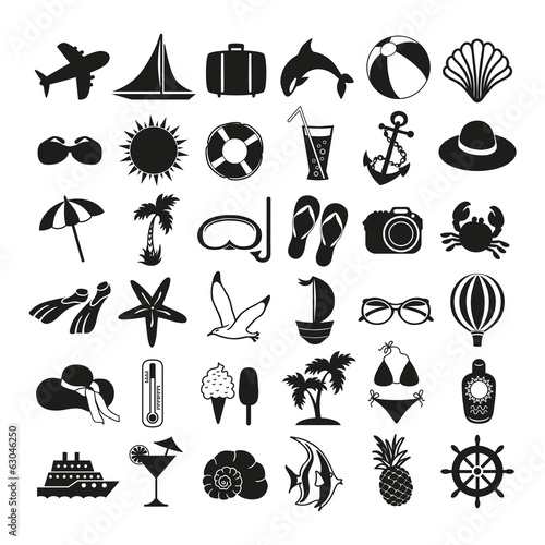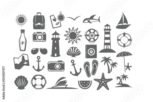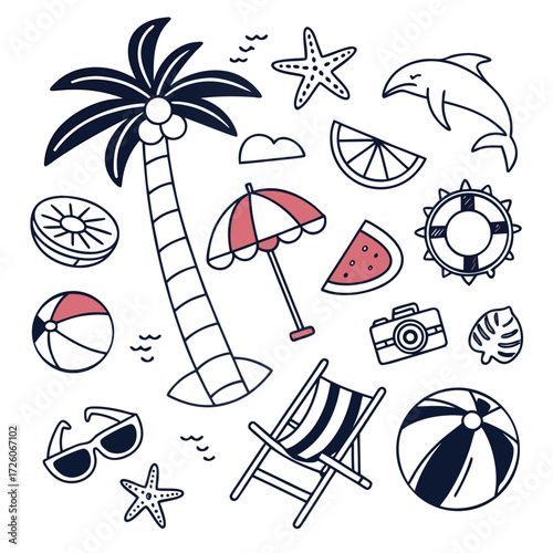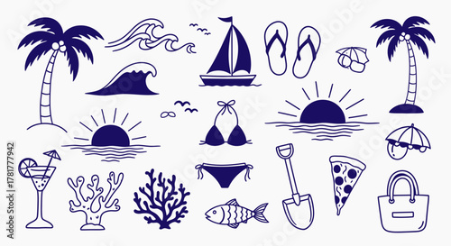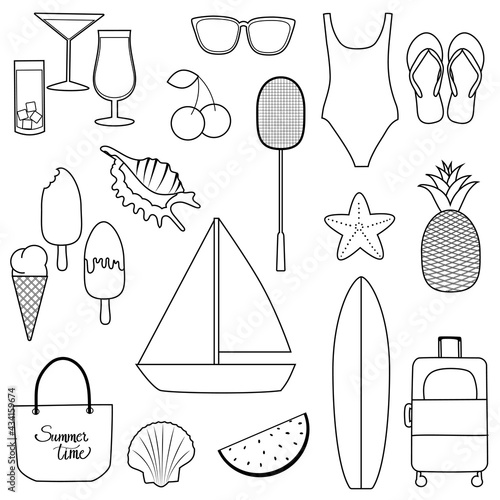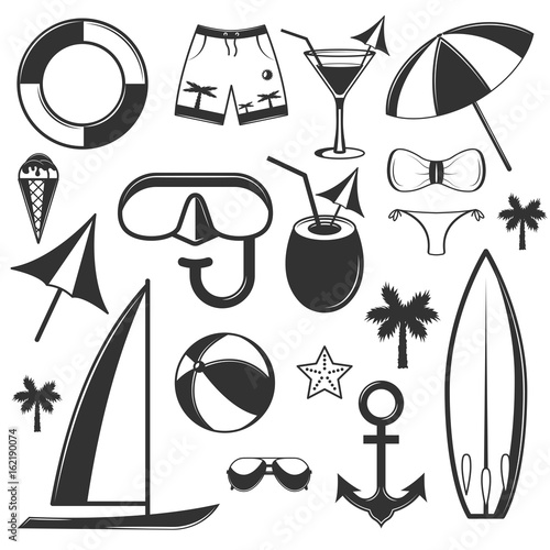 Векторный набор объектов летнего сезона в винтажном стиле. Элементы дизайна, значки, выделенные на белом фоне. Летний лагерь, пляжный отдых, отдых на тропическом море. - векторное изображение со склада