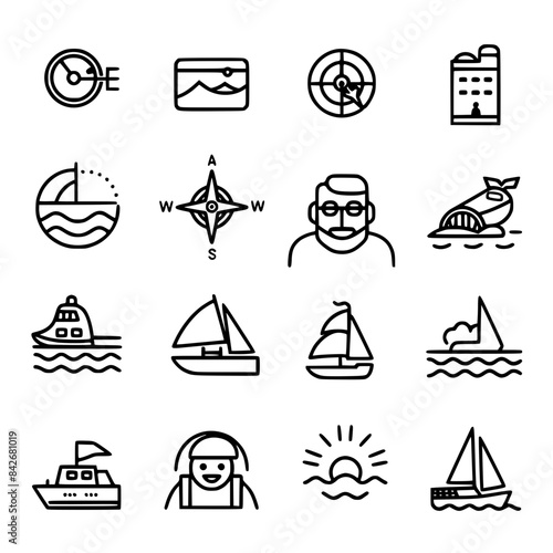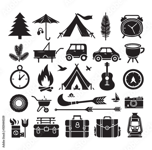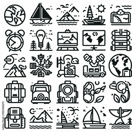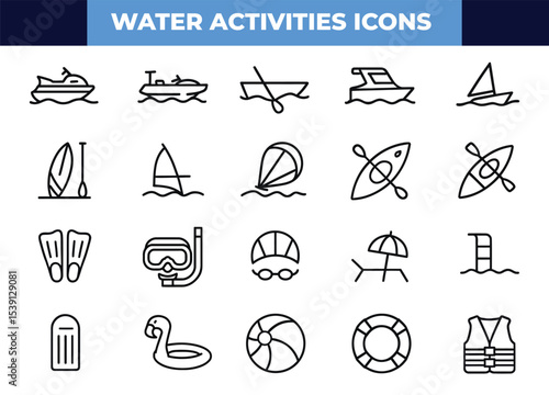 Векторный набор летних каникул, круизных каникул, автомобильных поездок, занятий водными видами спорта на байдарках и серфинге, винтажных монохромных логотипов, эмблем, этикеток и значков.