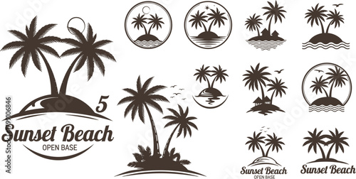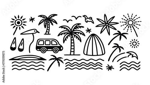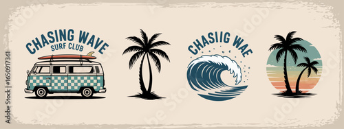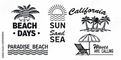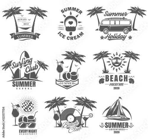Векторный набор летних приключений, пляжных каникул, ночных вечеринок, серфинга, винтажных логотипов, эмблем, этикеток и значков. Черно-белая монохромная иллюстрация в стиле ретро.
