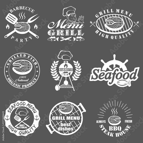 Эмблема барбекю и гриля, логотип, этикетка и набор значков, векторная рисованная иллюстрация в стиле ретро. Меню ресторана Steak house, вечеринка с барбекю, гриль-бар с винтажным типографским дизайном.