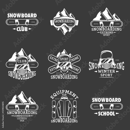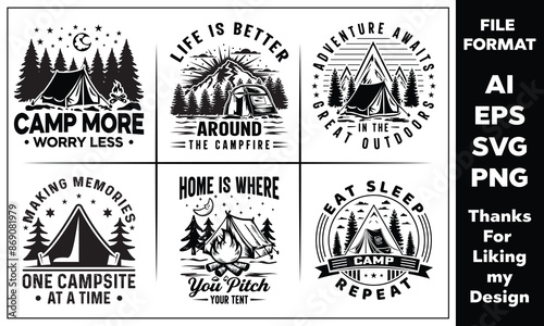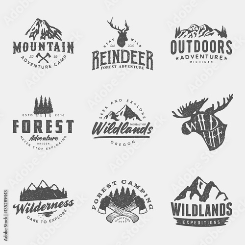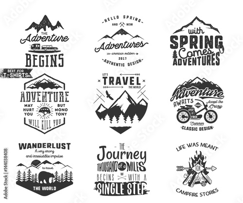 Набор наружных этикеток, эмблем, значков и логотипов, векторная монохромная иллюстрация в винтажном стиле. Горная экспедиция, приключения в путешествии, кемпинг, горные походы, туры на байдарках, надписи в лесном лагере.