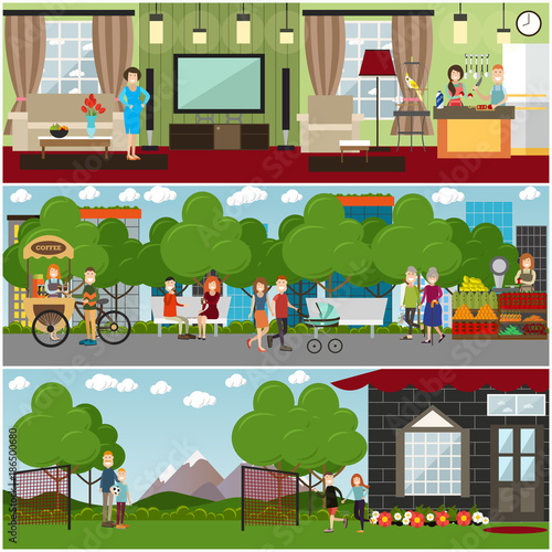Векторный набор концептуальных плакатов с дождливой, ветреной, снежной погодой, баннеров. Люди, получающие массу удовольствия в метель, гуляющие под дождем и убегающие от шторма, элементы дизайна в плоском стиле.