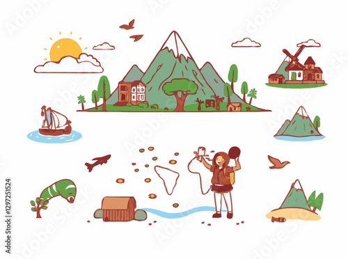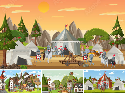 Векторный набор баннеров дикой северной Арктики, плакатов в плоском стиле. Арктические животные и эскимосские персонажи в традиционной одежде, их дома. Люди ловят рыбу, готовят еду, танцуют вокруг костра.