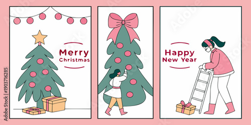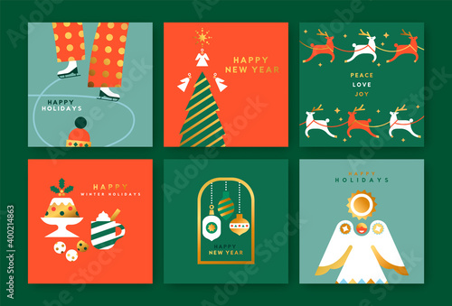 Векторный набор концептуальных плакатов зимних мероприятий для людей в плоском стиле. Кататься на санках, Играть в снежки, Кормить птиц, Лепить снеговика с элементами дизайна. Зимний городской пейзаж.