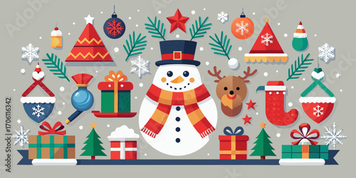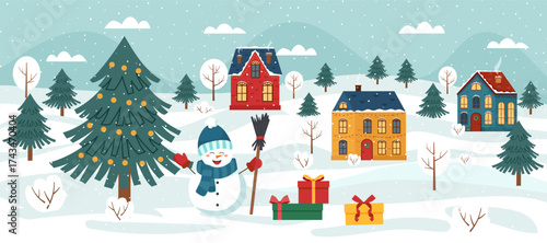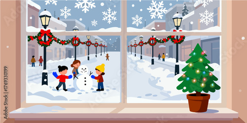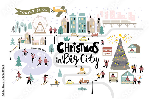 Векторный набор элементов дизайна концепции зимних мероприятий для людей в плоском стиле. Персонажи катаются на санках, играют в снежки, лепят снеговика и снежного ангела, очищают машину от снега, ходят по магазинам. Зимний городской пейзаж.