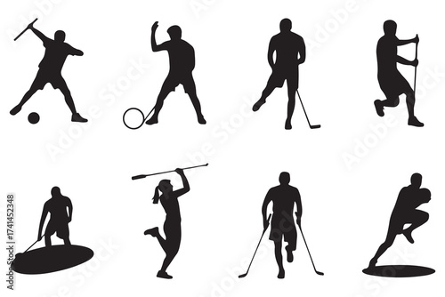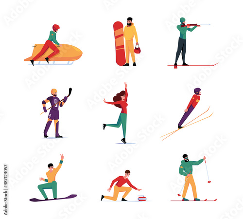 Векторный набор персонажей, катающихся на коньках, лыжах, сноуборде, изолированных на белом фоне. Дети и взрослые занимаются спортом. Элементы дизайна концепции зимних развлечений на открытом воздухе, иконки в плоском стиле.